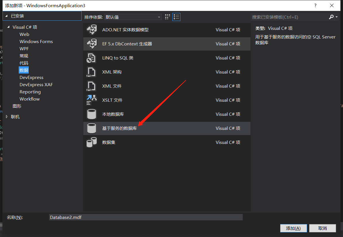 我们使用VisualStudio自带的mdf文件数据库,首先我们在工程中创建一个文件夹APP_DATA,在此文件夹中创建一个mdf文件