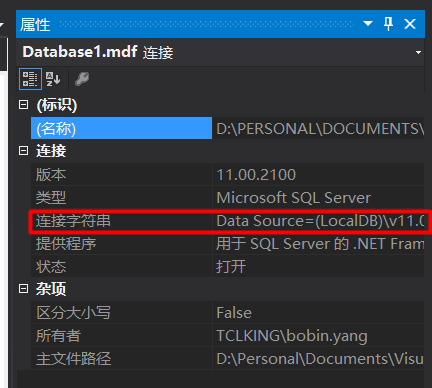ok我们现在在服务器资源管理器里面选择mdf文件,在属性列表里,找到连接字符串,拷贝一份出来,等会需要用的到