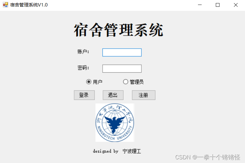 这是我的项目主页面,主要包括4个Label类,3个Button类,2个radioButton1,1个pictureBox1。主要的设计界面就如图所示。命名和图片大家可以自行的设置,通过对组件的Text属性进行设置,radioButton具有一个Checked属性,可以控制默认的多选框。(例如我的在用户)