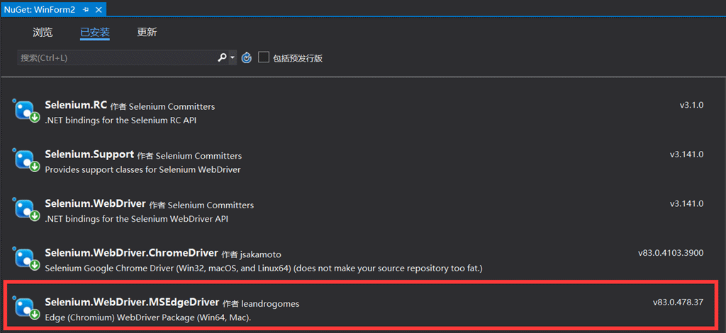 然后再需要引用浏览器驱动库,这里我以新版Edge浏览器为例,新版Edge使用方式跟Chrome是一样的,程序包名称为Selenium.WebDriver.MSEdgeDriver。