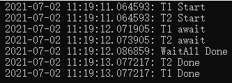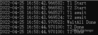 再上结果,注意看T1、T2 Done 和 WaitAll Done的打印时间: