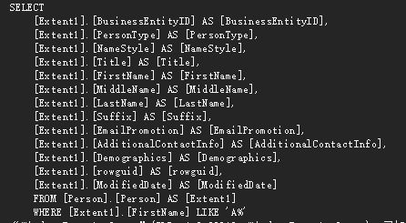 string esql = "select value e from AdventureWorks2012Entities.Person as e where e.FirstName like 'A%'";//获取所有列,不能使用Select *