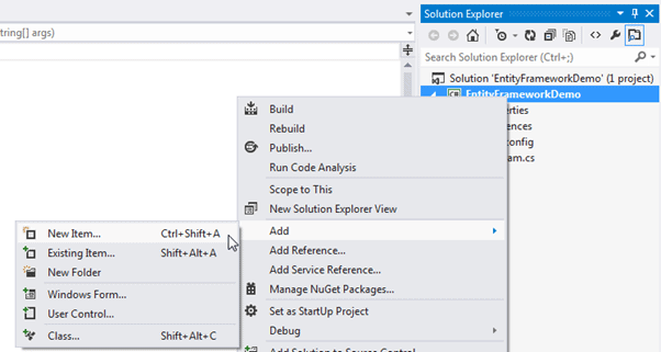 要将代码优先用于现有数据库,请在Visual Studio中右键单击您的项目->添加->新建项。