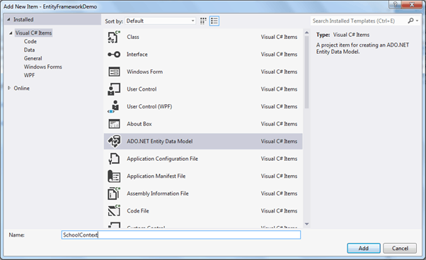 在“添加新项”对话框中选择“ADO.NET实体数据模型”,并指定模型名称(这将是上下文类名称),然后单击“添加”。