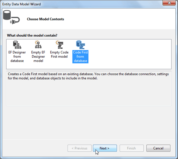 这将打开“实体数据模型”向导,如下所示。从数据库选项中选择代码优先,然后单击下一步。