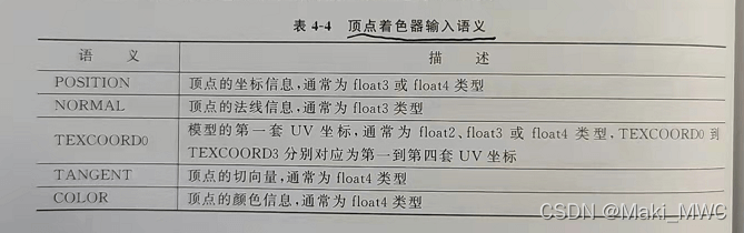 顶点数据是以输入参数的方式传递给顶点函数的,每一个输入的参数都需要填充一个语义,用于表示所传递的数据。