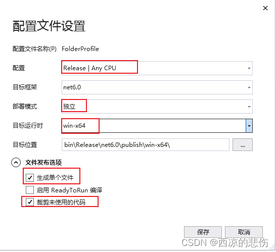 6.部署模式选择独立,目标运行时我这里选择针对 64 位的 windos ,文件发布选项选择 生成单个文件和裁剪未使用的代码。