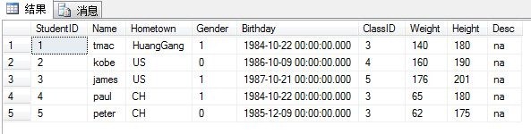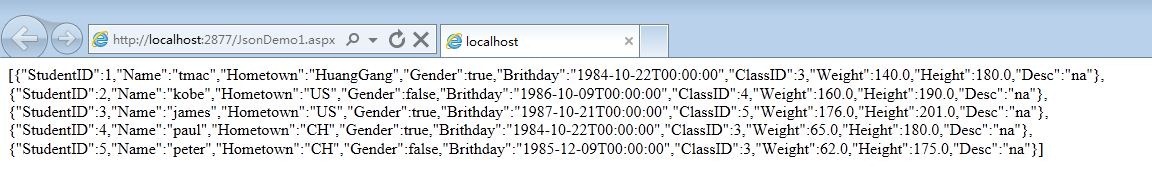 从表中我们可以看到一共有五条数据,现在我们要从数据库中取出这些数据,然后利用JSON.NET的JsonConvert对象序列化它们为json字符串,并显示在页面上。C#代码如下
