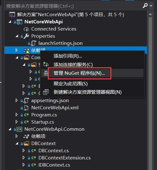 1.在要添加的项目中选中 依赖项->右键->管理NuGet程序包(N)