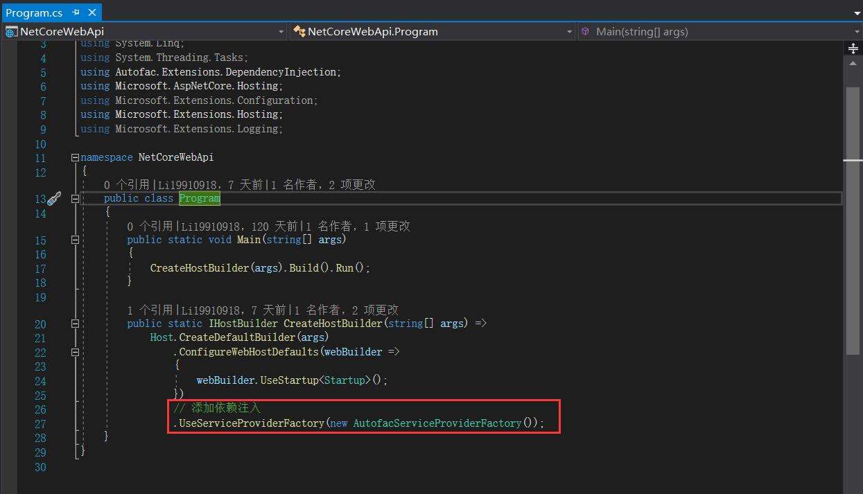 public static IHostBuilder CreateHostBuilder(string[] args) => Host.CreateDefaultBuilder(args) .ConfigureWebHostDefaults(webBuilder => { webBuilder.UseStartup<Startup>(); }) // 添加依赖注入 .UseServiceProviderFactory(new AutofacServiceProviderFactory());