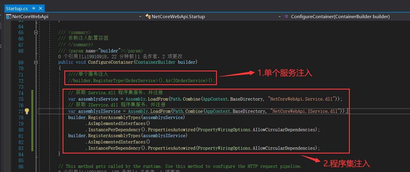 /// <summary> /// 依赖注入配置容器 /// </summary> /// <param name="builder"></param> public void ConfigureContainer(ContainerBuilder builder) { ////单个服务注入 //builder.RegisterType<OrderService>().As<IOrderService>(); // 获取 Service.dll 程序集服务,并注册 var assemblysService = Assembly.LoadFrom(Path.Combine(AppContext.BaseDirectory, "NetCoreWebApi.Service.dll")); // 获取 IService.dll 程序集服务,并注册 var assemblysIService = Assembly.LoadFrom(Path.Combine(AppContext.BaseDirectory, "NetCoreWebApi.IService.dll")); builder.RegisterAssemblyTypes(assemblysService) .AsImplementedInterfaces() .InstancePerDependency().PropertiesAutowired(PropertyWiringOptions.AllowCircularDependencies); builder.RegisterAssemblyTypes(assemblysIService) .AsImplementedInterfaces() .InstancePerDependency().PropertiesAutowired(PropertyWiringOptions.AllowCircularDependencies); }