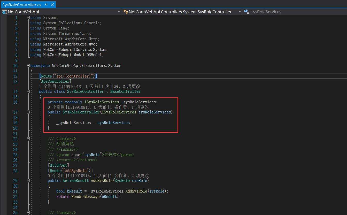 private readonly ISysRoleServices _sysRoleServices; public SysRoleController(ISysRoleServices sysRoleServices) { _sysRoleServices = sysRoleServices; }