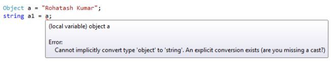 ps:上面的a为string类型;a1为object类型,保存着a的副本。因此不能将a1显示转换为int类型。