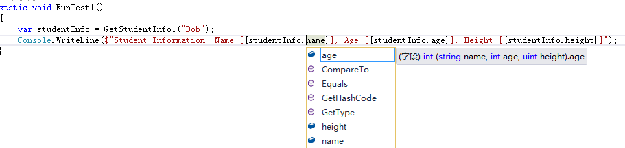 var (name, age, height) = GetStudentInfo1("Bob");