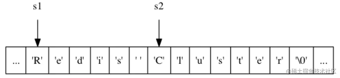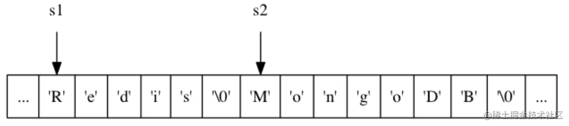 假设程序里有两个在内存中紧邻着的 C 字符串 s1 和 s2 ,其中 s1 保存了字符串 "Redis" ,而 s2 则保存了字符串 "MongoDB" .