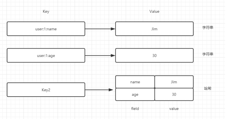 }通过下图可以直观感受一下字符串类型和哈希类型的区别: