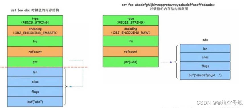 并且释放embstr编码的字符串对象只需要调用一次内存释放函数,而释放raw编码对象的字符串对象需要调用两次内存释放函数,如图所示,左边emstr编码,右边是raw编码: