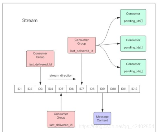 每个Stream都可以挂多个消费组,每个消费组会有个游标last_delivered_id在Stream数组之上往前移动,表示当前消费组已经消费到哪条消息了。每个消费组都有一个Stream内唯一的名称,消费组不会自动创建,它需要单独的指令xgroup create进行创建,需要指定从Stream的某个消息ID开始消费,这个ID用来初始化last_delivered_id变量。