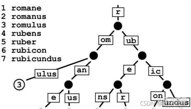 能够这样说,比方一个数10001010101010110101010,那么依照Radix 树的插入就是在根节点,假设遇到0,就指向左节点,假设遇到1就指向右节点,在插入过程中构造树节点,在删除过程中删除树节点。如下是一个保存了7个单词的Radix Tree:
