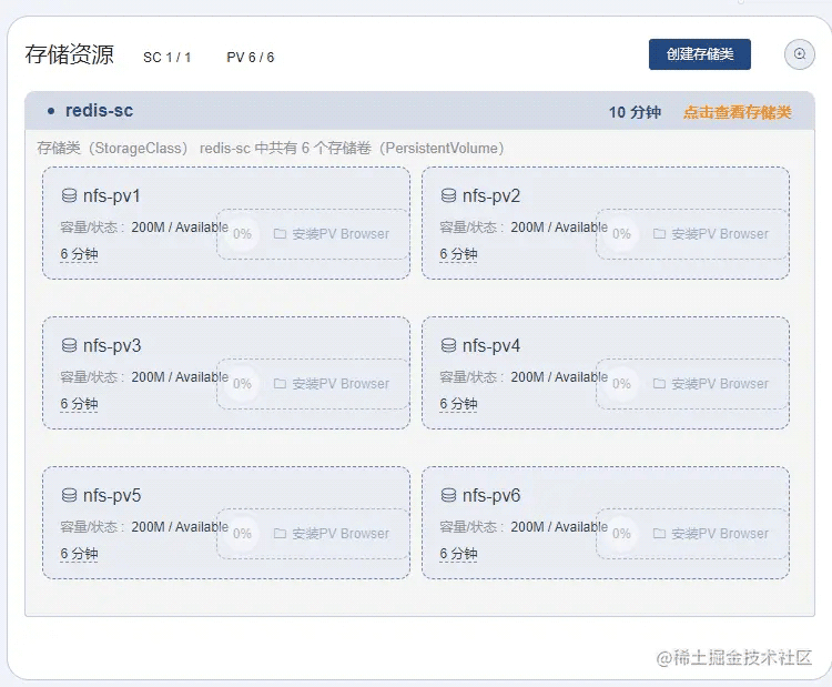 使用SC、PV就可以实现,这6个pod启动,就对应上我们创建的6个PV,那就实现了redis.conf、nodes.conf、data,这三个文件,存放的路径,就是不一样的路径了。