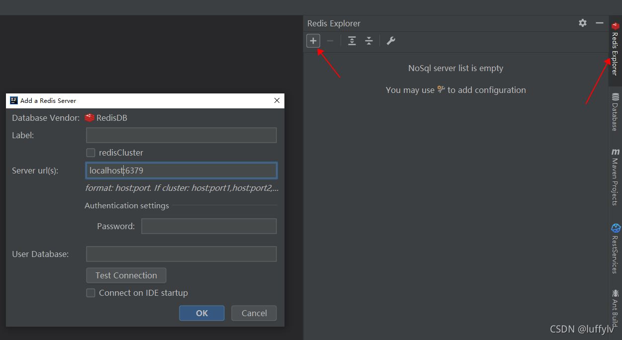 安装完后,通过右侧工具栏或File->Setting->Other Settings->NoSql Server可找到连接Redis的窗口,如下图: