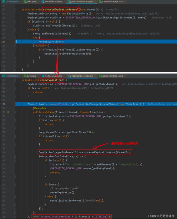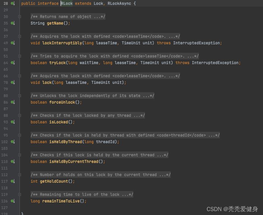 RLock接口主要继承了Lock接口,并扩展了部分方法,比如:tryLock(long waitTime, long leaseTime, TimeUnit unit)方法中加入的leaseTime参数,用来设置锁的过期时间,如果超过leaseTime还没有解锁的话,redis就强制解锁;leaseTime的默认时间是30s。