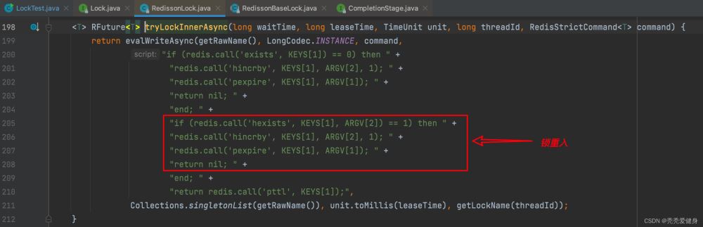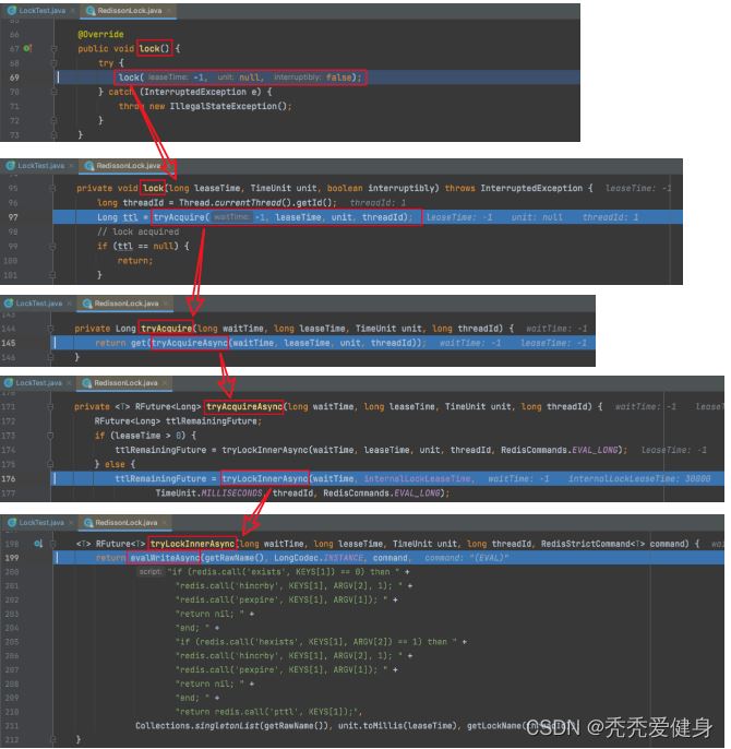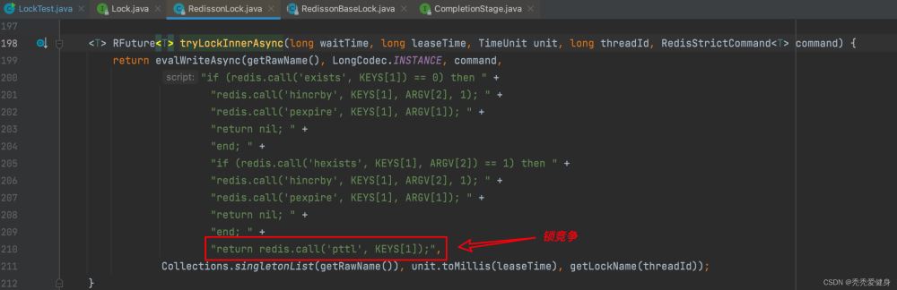 在寻找应该在哪台Redis机器上加锁时,在RedissonLock#tryLockInnerAsync()方法中我们看到了一堆LUA脚本: