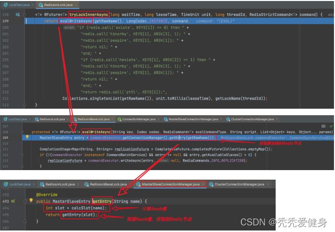 ConnectionManager#getEntry(String)方法会根据传入的key名称找到相应的Redis节点、目标master。