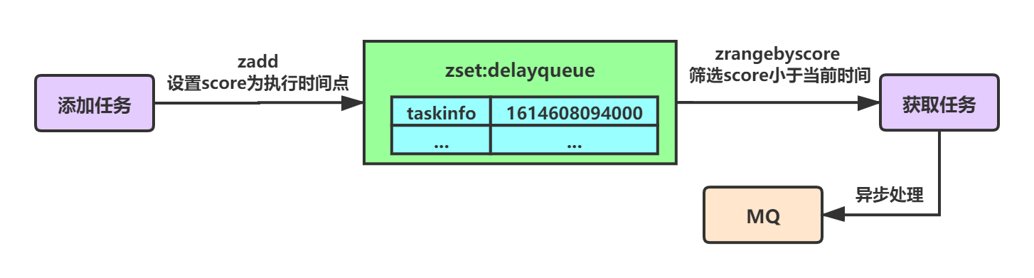 实现原理是利用zset的score属性,redis会将zset集合中的元素按照score进行从小到大排序,通过zadd命令向zset中添加元素,如下述命令所示,其中value值为延时任务消息,可根据业务定义消息格式,score值为任务执行的时间点,比如13位毫秒时间戳。