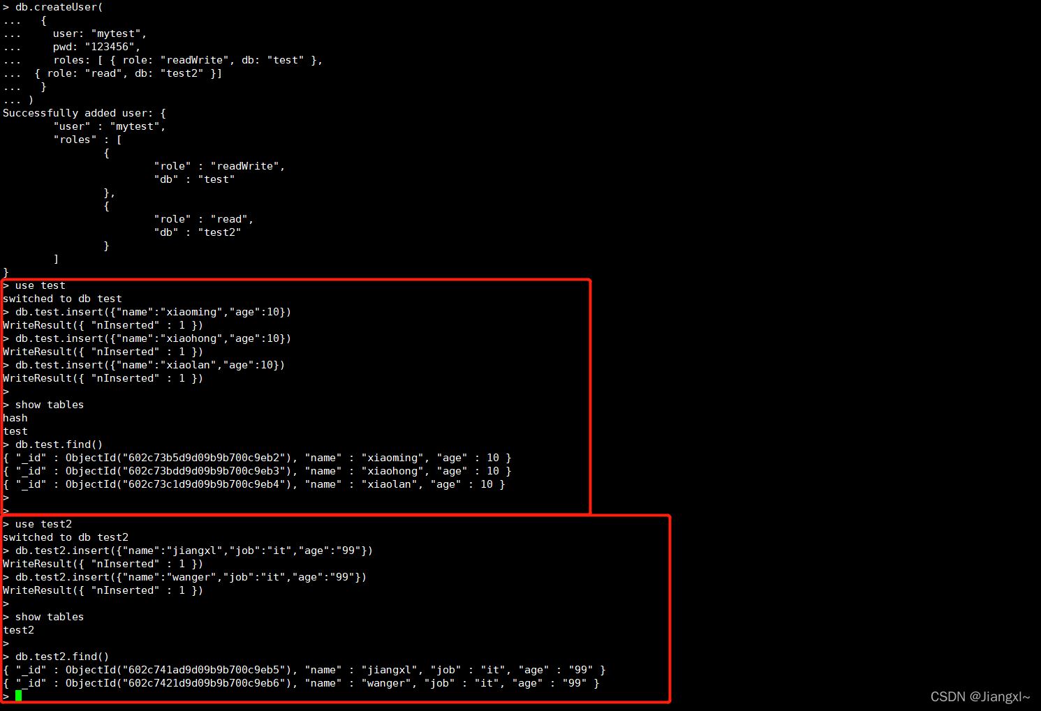 > db.test2.insert({"name":"jiangxl","job":"it","age":"99"})