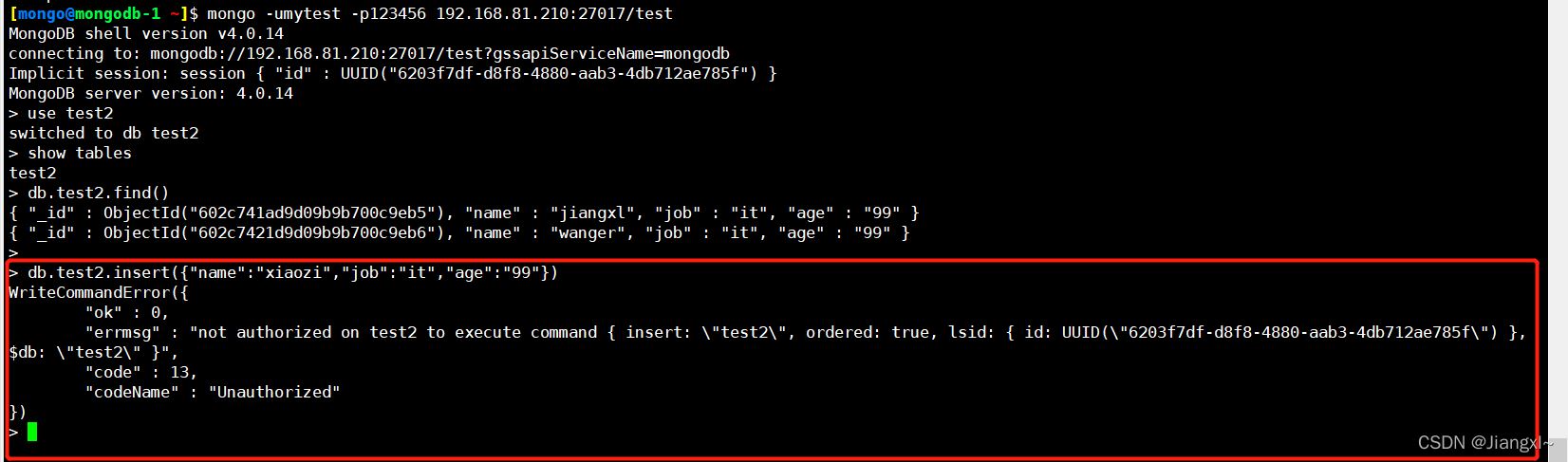 "errmsg" : "not authorized on test2 to execute command { insert: \"test2\", ordered: true, lsid: { id: UUID(\"6203f7df-d8f8-4880-aab3-4db712ae785f\") }, $db: \"test2\" }",