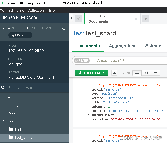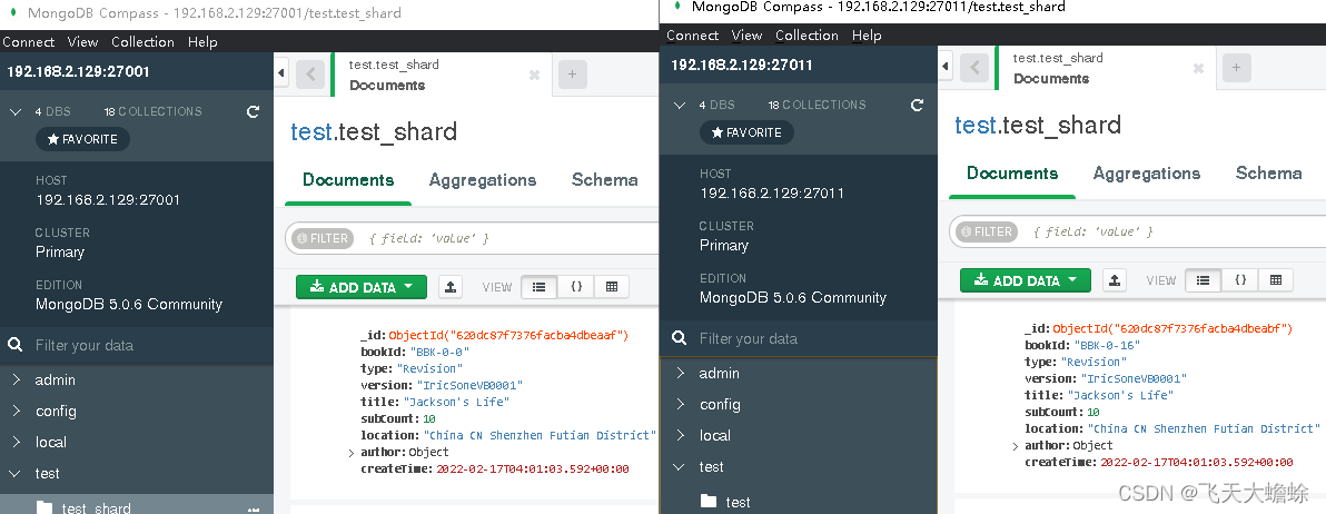}在windows下安装mongodb,利用自带的compass客户端观察两个shard集群