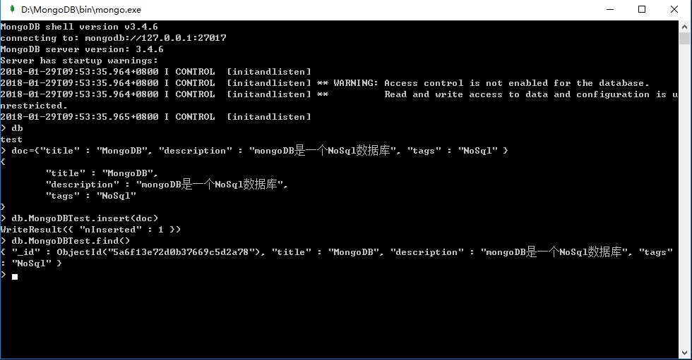 {"title" : "MongoDB", "description" : "mongoDB是一个NoSql数据库", "tags" : "NoSql" }1、使用insert()方法插入文档
