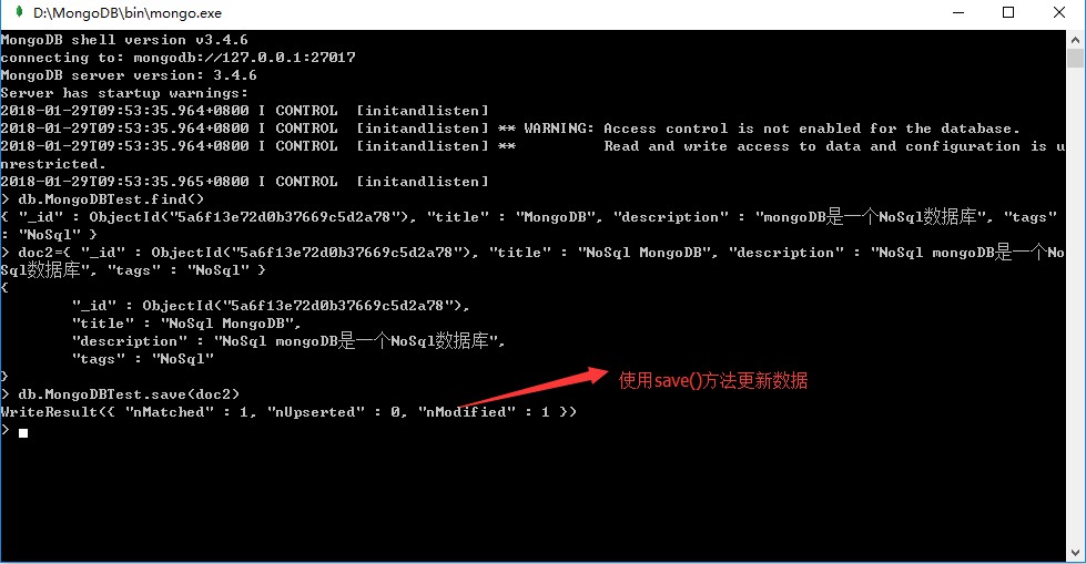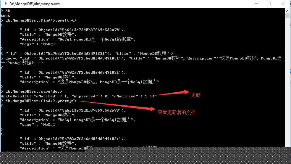 插入文档也可以使用save()方法。如果不知道_id字段save()方法类似于insert()方法。如果指定_id字段,则会更新该_id的数据。