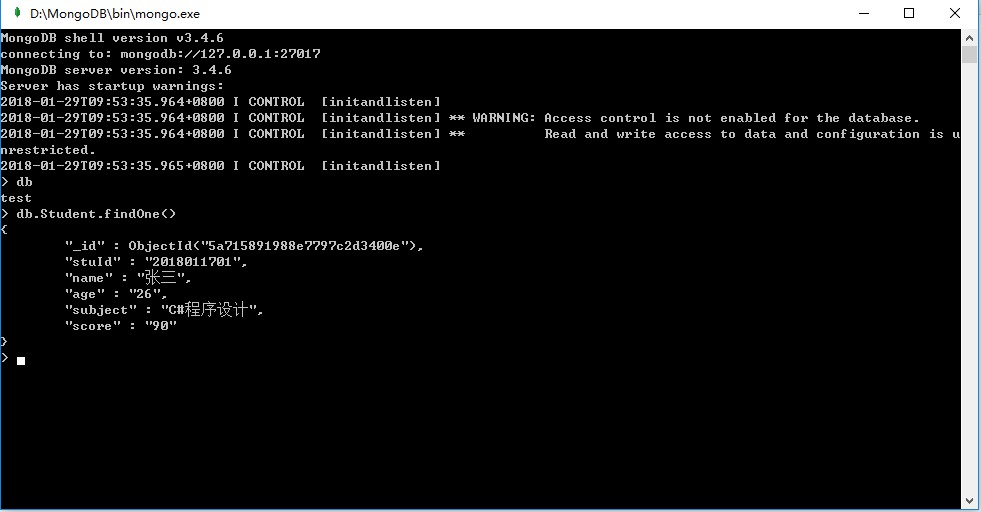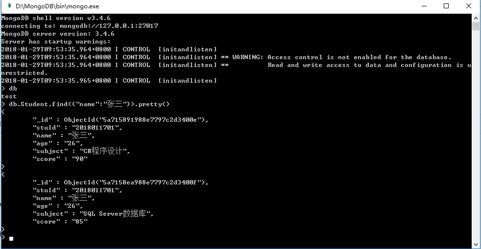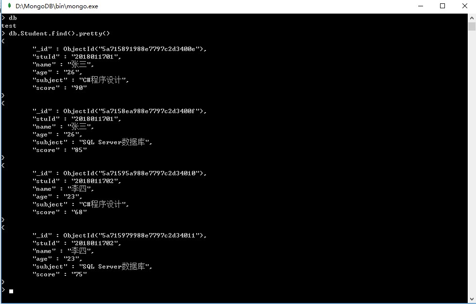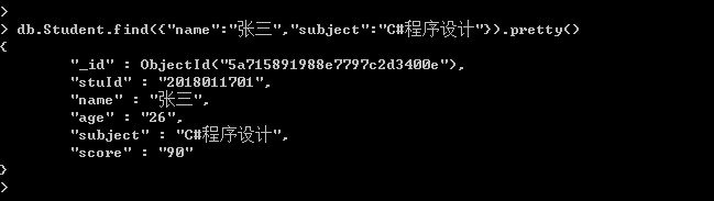 db.Student.find({"name":"张三","subject":"C#程序设计"}).pretty()查询结果如下图所示: