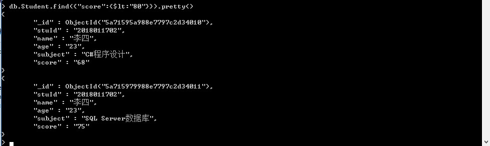 db.Student.find({"score":{$lt:"80"}}).pretty()查询结果如下图所示: