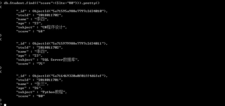 db.Student.find({"score":{$lte:"80"}}).pretty()查询结果如下图所示: