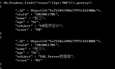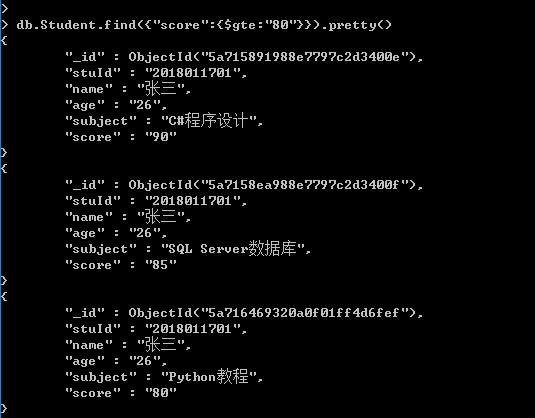 db.Student.find({"score":{$gte:"80"}}).pretty()查询结果如下图所示:
