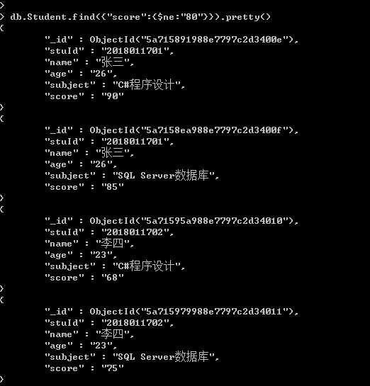 db.Student.find({"score":{$ne:"80"}}).pretty()查询结果如下图所示:
