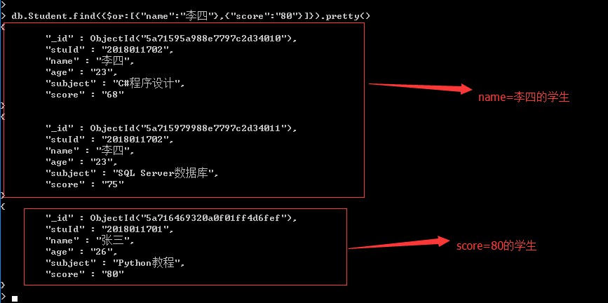 db.Student.find({$or:[{"name":"李四"},{"score":"80"}]}).pretty()查询结果如下图所示: