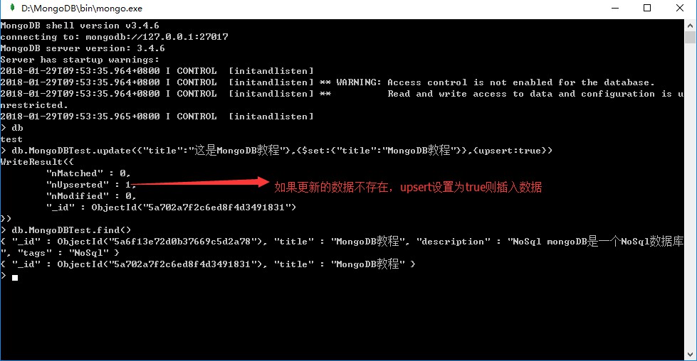 - upsert:可选参数,这个参数的意思是:如果不存在update的记录,是否插入新的文档。如果为true则插入,默认是false不插入。