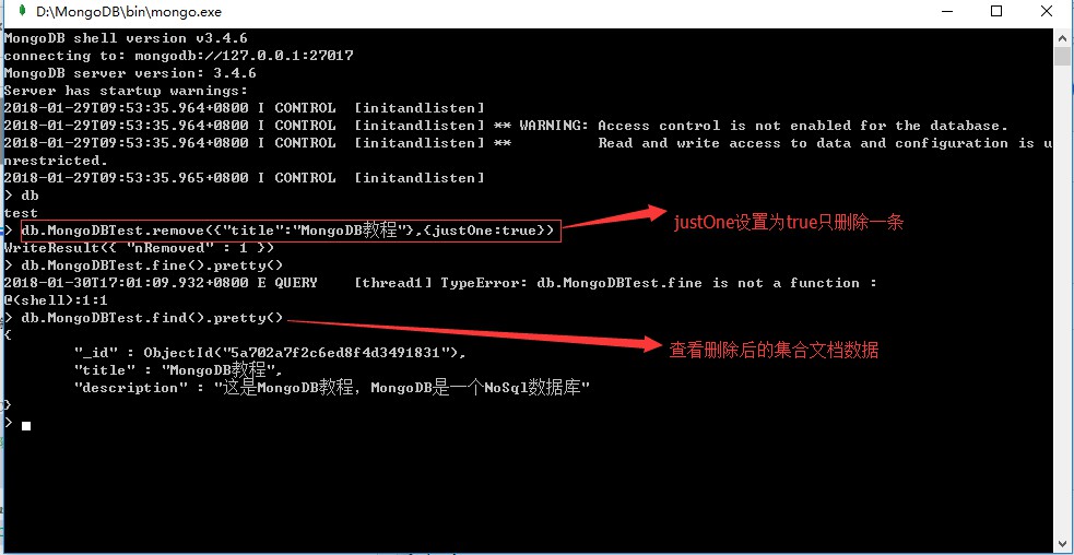 - justOne:可选参数,如果设为true或1,则只删除一个文档。