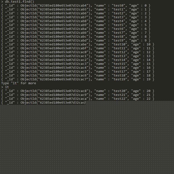 for(i=0;i<100000;i++){db.test.insert({name:'test'+i,age:i})}