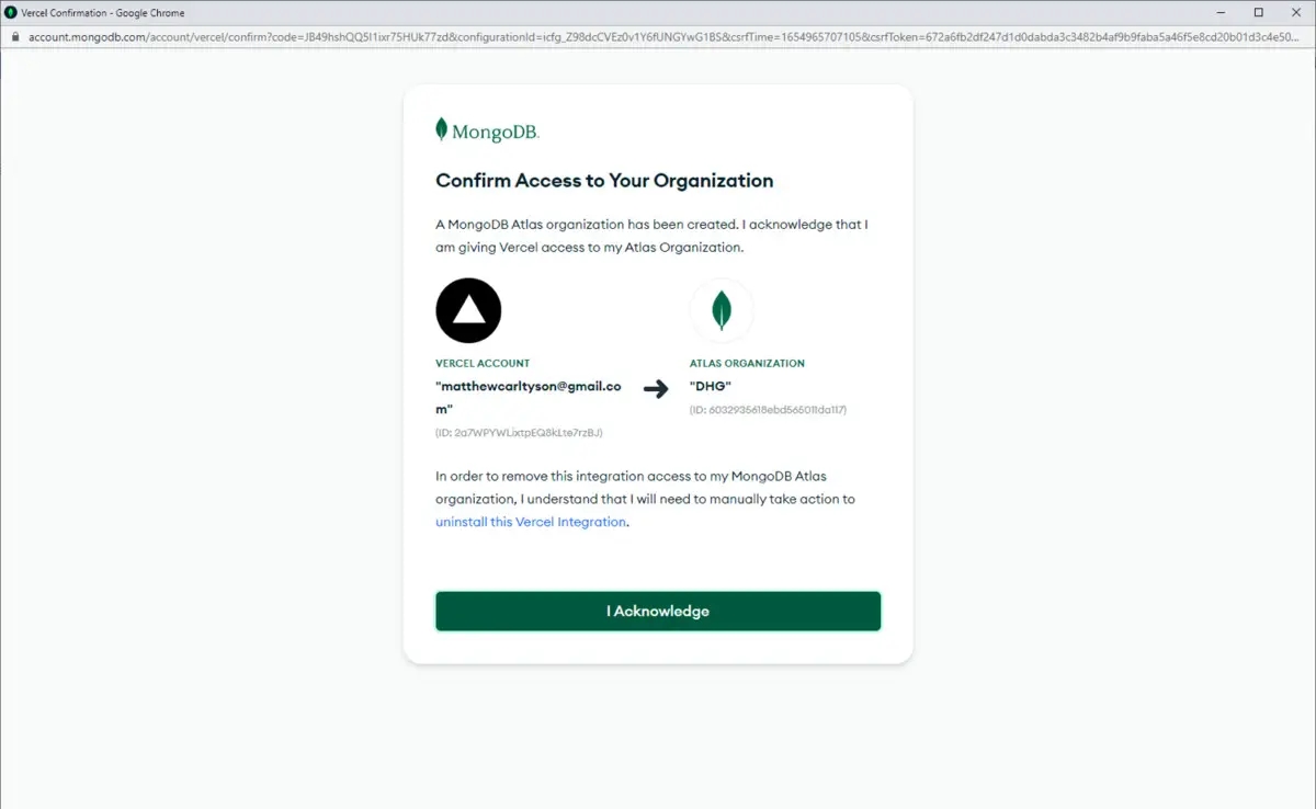 接下来,一个对话框将询问将集成添加到哪个MongoDB Atlas组织。使用你为你的用户设置的默认值即可。