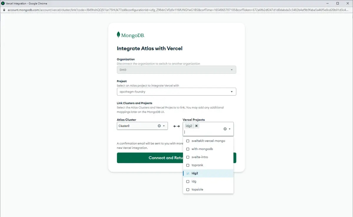 下一步是在MongoDB Atlas集群和Vercel项目之间创建桥梁。确保你在Vercel方面选择了正确的项目!