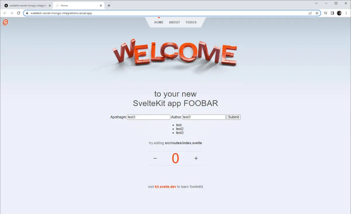 我们的演示应用程序是一个 SvelteKit 应用程序,它允许创建一个简单的文档,即 apothegm,带有一个文本和作者字段,并显示数据库中的 apothegms 列表。对于我们的文件的文本,我们将使用一些精炼的神谕。
