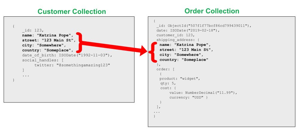 扩展引用模式认为,客户的名称和地址是不常做更新的,可以直接将这些信息冗余进订单表中,以达到减少两个集合连接查询的要求。