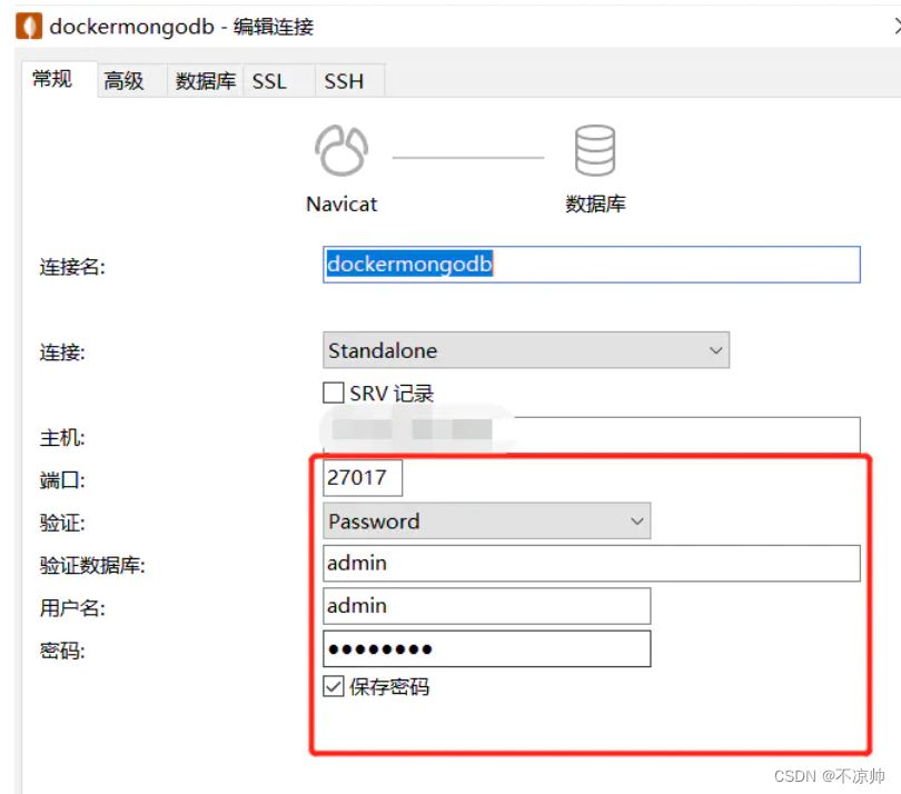 docker run --name mongodb-server -p 27017:27017 -v ~/data/mongodata:/data -d mongoNavicat远程连接MongoDB