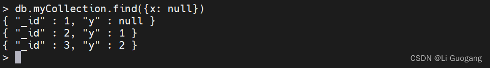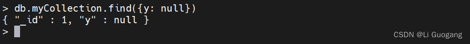 那么可以按照预期的方式查询 “y” 键为 null 的文档: