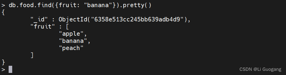> db.food.insertOne({fruit: ["apple", "banana", "peach"]})
